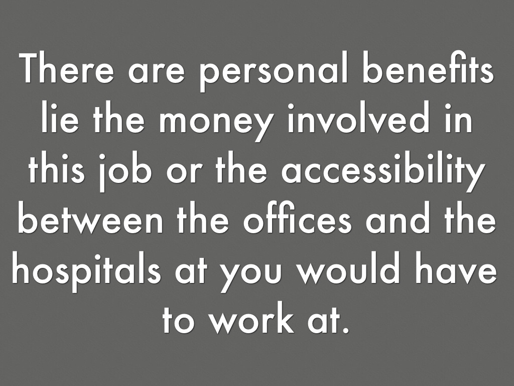 There are personal benefits lie the money involved in this job or the accessibility between the offices and the hospitals at you would have to work at.