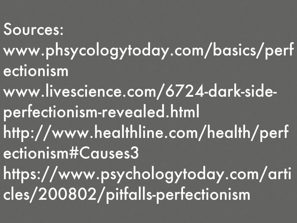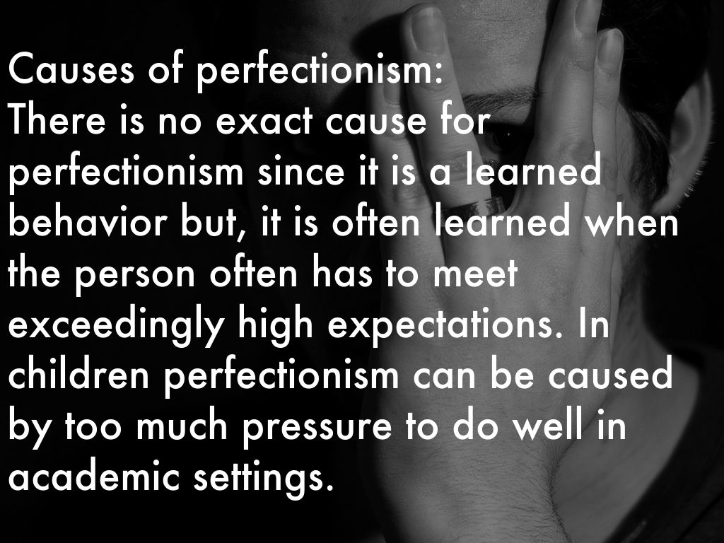 Causes of perfectionism: There is no exact cause for perfectionism since it is a learned behavior but, it is often learned when the person often has to meet exceedingly high expectations. In children perfectionism can be caused by too much pressure to do well in academic settings.