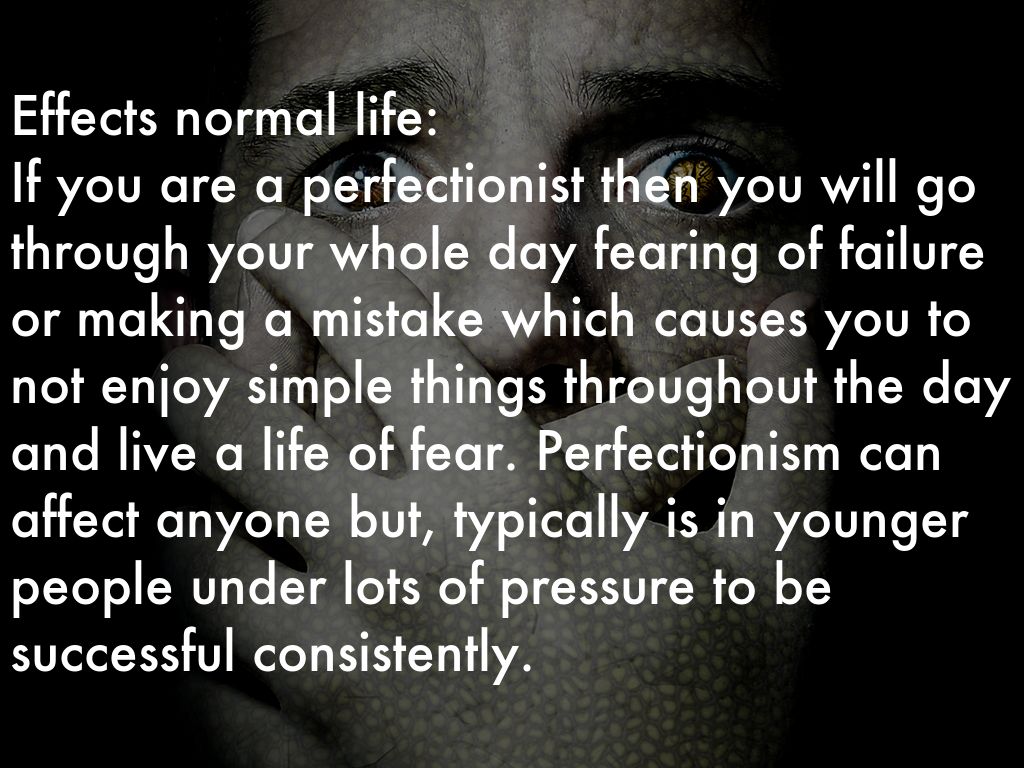 Effects normal life: If you are a perfectionist then you will go through your whole day fearing of failure or making a mistake which causes you to not enjoy simple things throughout the day and live a life of fear. Perfectionism can affect anyone but, typically is in younger people under lots of pressure to be successful consistently.
