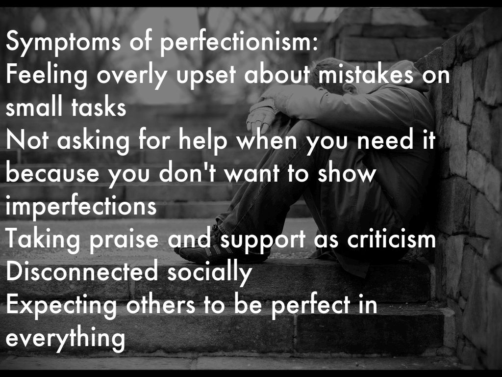 Symptoms of perfectionism: Feeling overly upset about mistakes on small tasks Not asking for help when you need it because you don't want to show imperfections Taking praise and support as criticism Disconnected socially Expecting others to be perfect in everything
