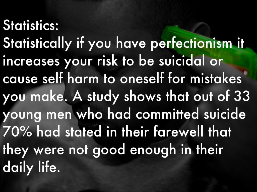 Statistics: Statistically if you have perfectionism it increases your risk to be suicidal or cause self harm to oneself for mistakes you make. A study shows that out of 33 young men who had committed suicide 70% had stated in their farewell that they were not good enough in their daily life.