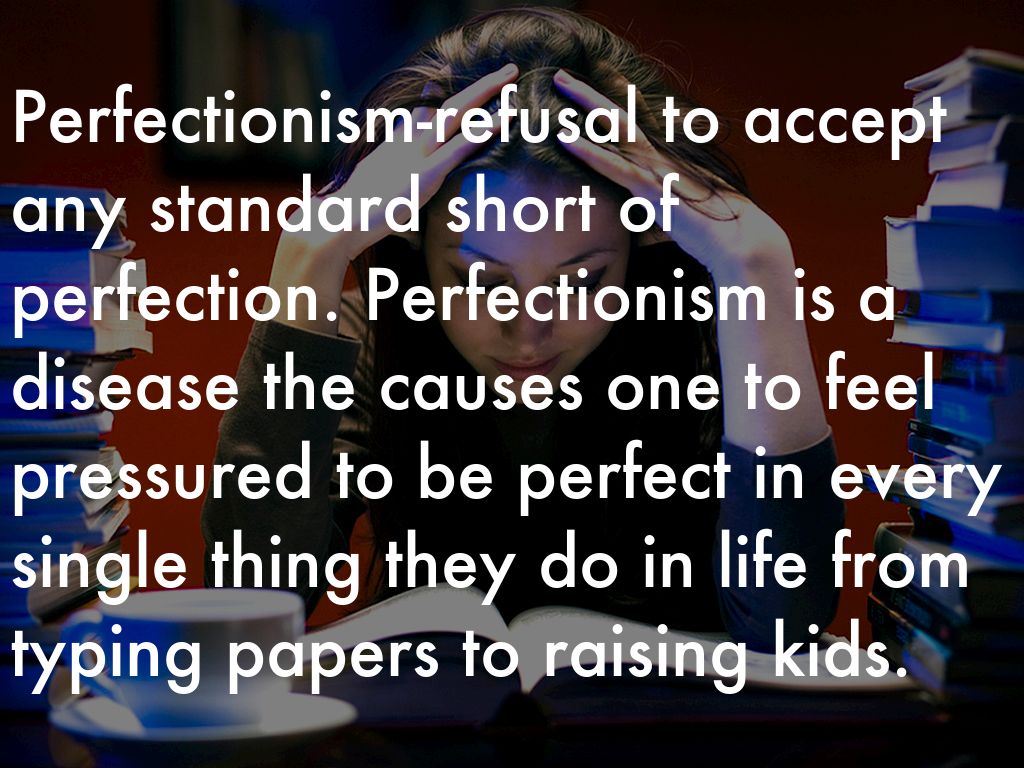 Perfectionism-refusal to accept any standard short of perfection. Perfectionism is a disease the causes one to feel pressured to be perfect in every single thing they do in life from typing papers to raising kids.