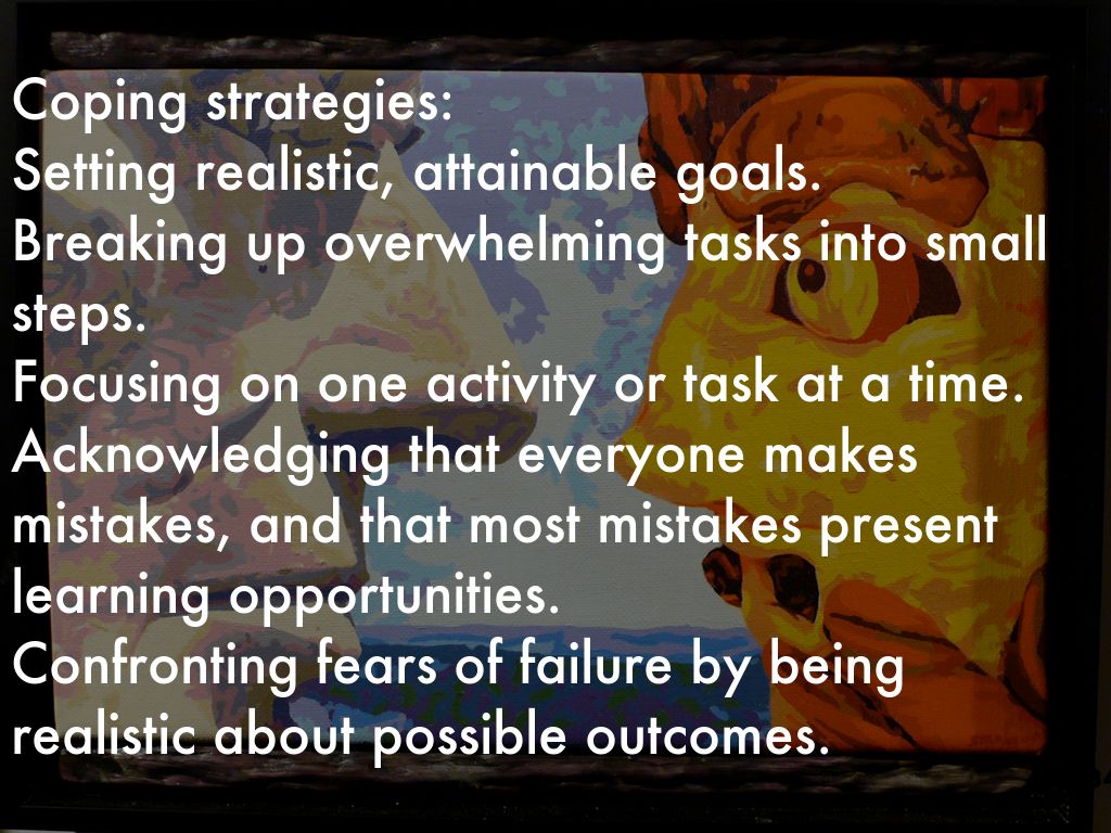 Coping strategies: Setting realistic, attainable goals. Breaking up overwhelming tasks into small steps. Focusing on one activity or task at a time. Acknowledging that everyone makes mistakes, and that most mistakes present learning opportunities. Confronting fears of failure by being realistic about possible outcomes.