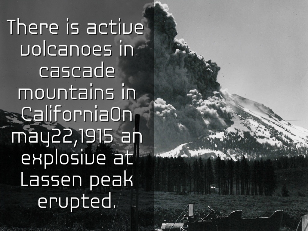 There is active volcanoes in cascade mountains in CaliforniaOn may22,1915 an explosive at Lassen peak erupted.
