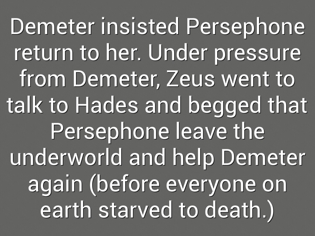 Demeter insisted Persephone return to her. Under pressure from Demeter, Zeus went to talk to Hades and begged that Persephone leave the underworld and help Demeter again (before everyone on earth starved to death.)