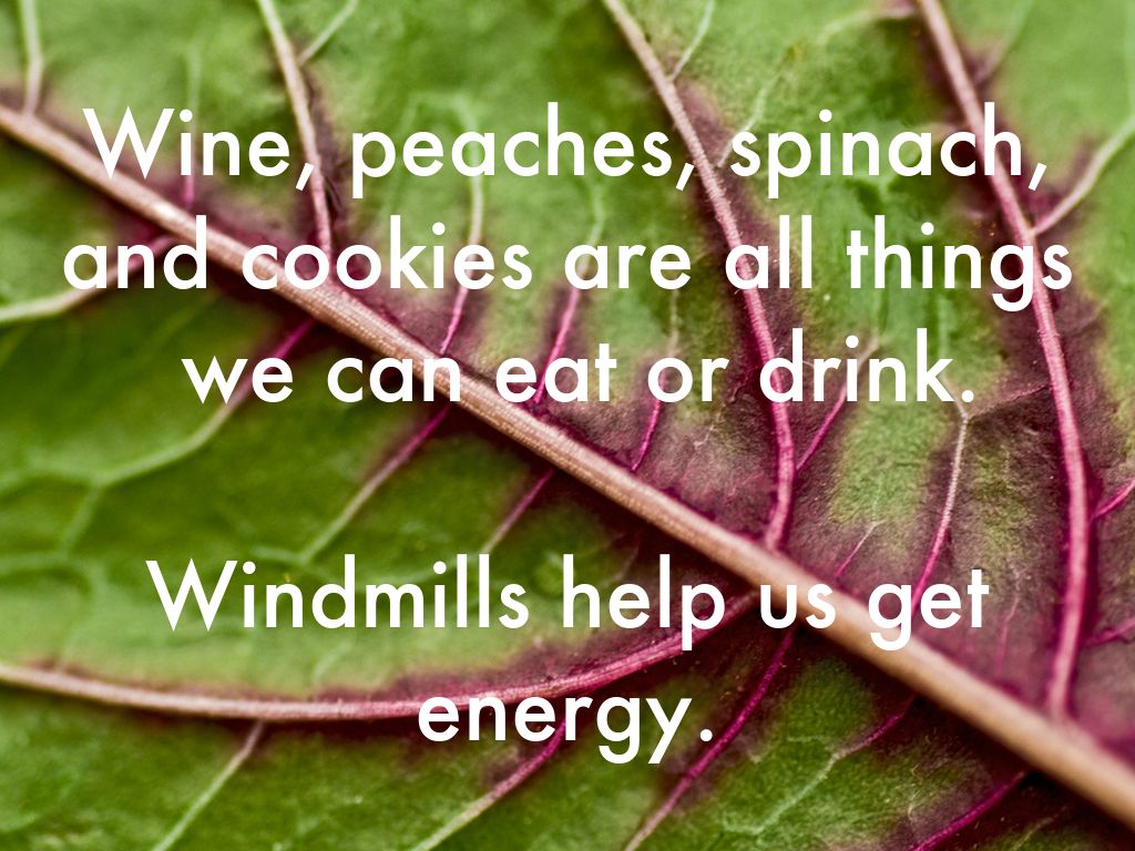 Wine, peaches, spinach, and cookies are all things we can eat or drink.
