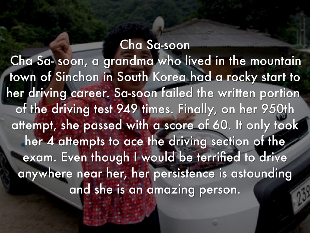 Cha Sa- soon, a grandma who lived in the mountain town of Sinchon in South Korea had a rocky start to her driving career. Sa-soon failed the written portion of the driving test 949 times. Finally, on her 950th attempt, she passed with a score of 60. It only took her 4 attempts to ace the driving section of the exam. Even though I would be terrified to drive anywhere near her, her persistence is astounding and she is an amazing person.