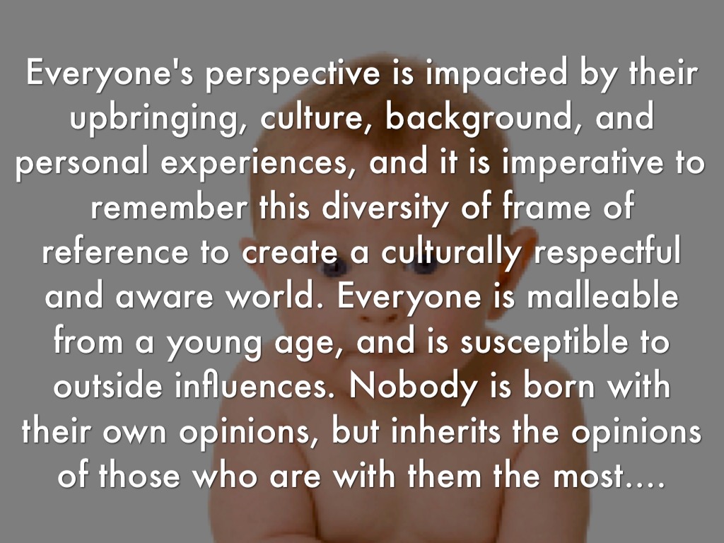 Everyone's perspective is impacted by their upbringing, culture, background, and personal experiences, and it is imperative to remember this diversity of frame of reference to create a culturally respectful and aware world. Everyone is malleable from a young age, and is susceptible to outside influences. Nobody is born with their own opinions, but inherits the opinions of those who are with them the most.