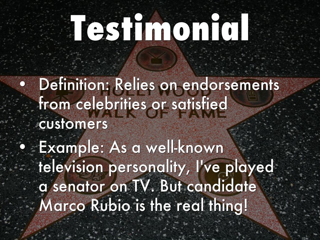 Definition: Relies on endorsements from celebrities or satisfied customers