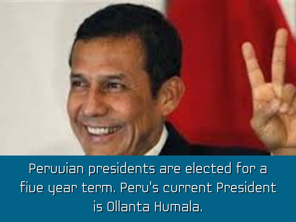 Peruvian presidents are elected for a five year term. Peru's current President is Ollanta Humala.