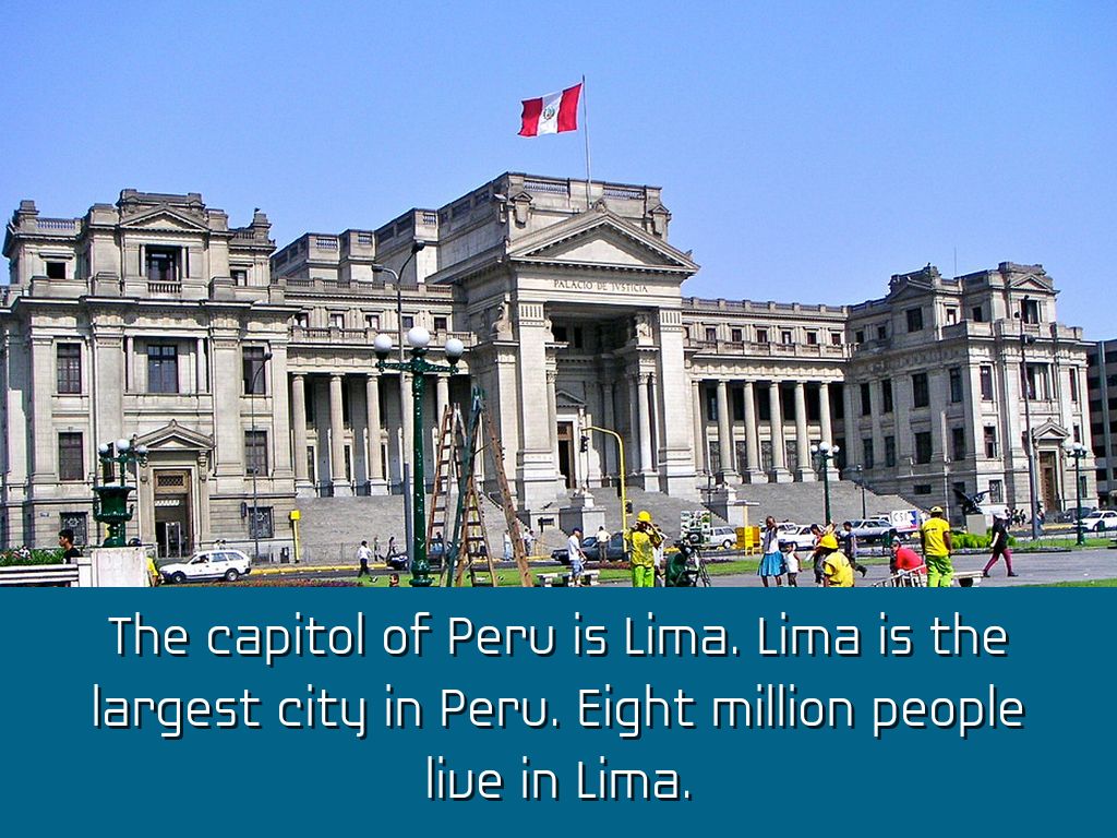 The capitol of Peru is Lima. Lima is the largest city in Peru. Eight million people live in Lima.