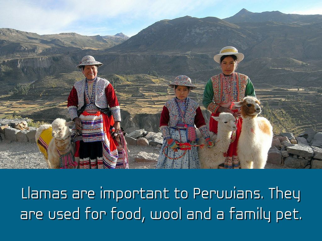 Llamas are important to Peruvians. They are used for food, wool and a family pet.