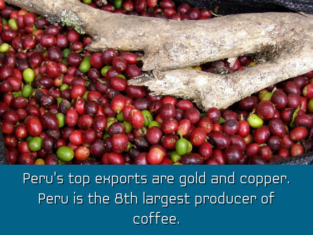 Peru's top exports are gold and copper. Peru is the 8th largest producer of coffee.