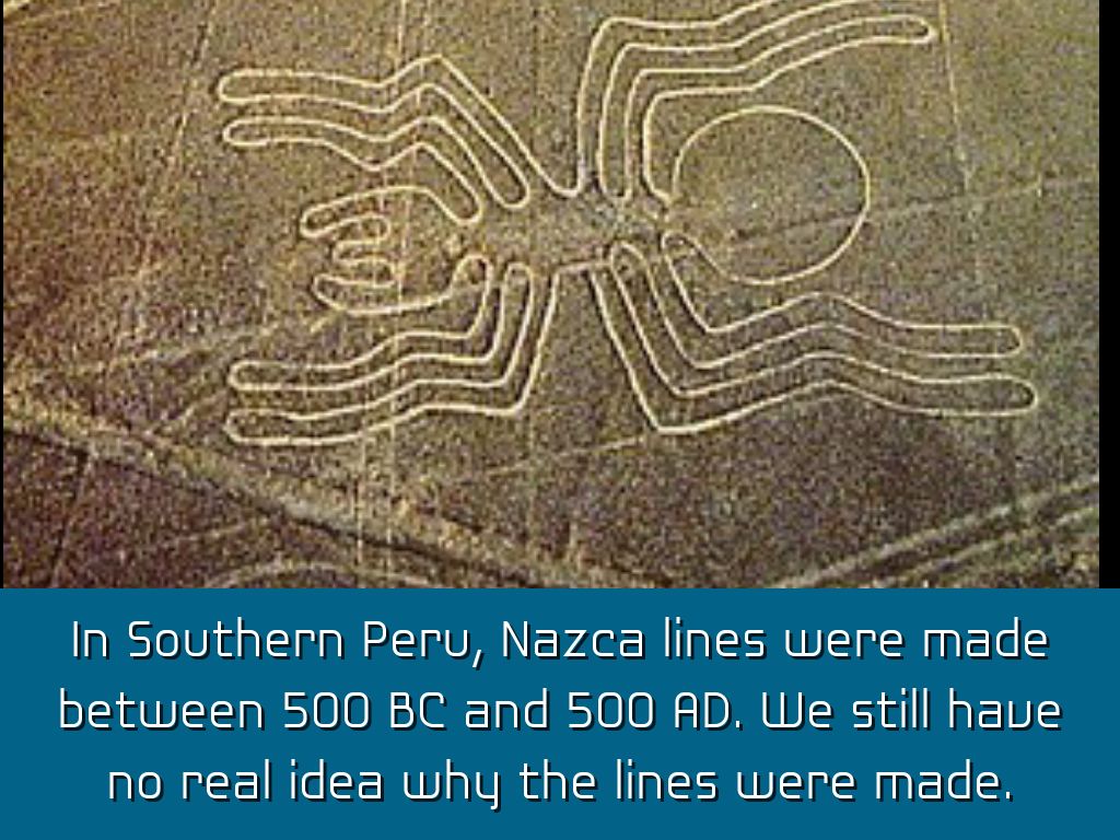 In Southern Peru, Nazca lines were made between 500 BC and 500 AD. We still have no real idea why the lines were made.