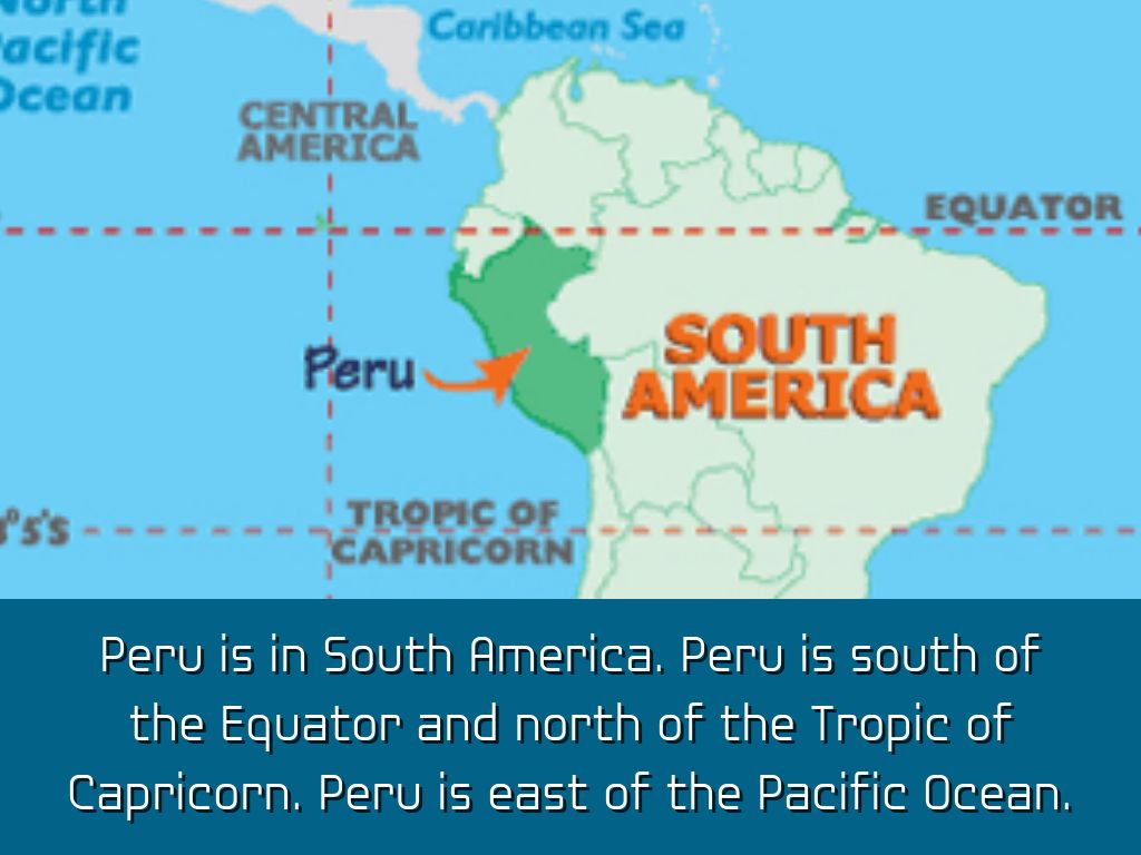 Peru is in South America. Peru is south of the Equator and north of the Tropic of Capricorn. Peru is east of the Pacific Ocean.
