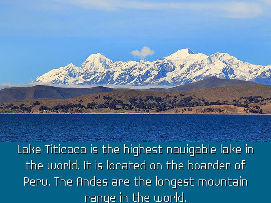 Lake Titicaca is the highest navigable lake in the world. It is located on the boarder of Peru. The Andes are the longest mountain range in the world.