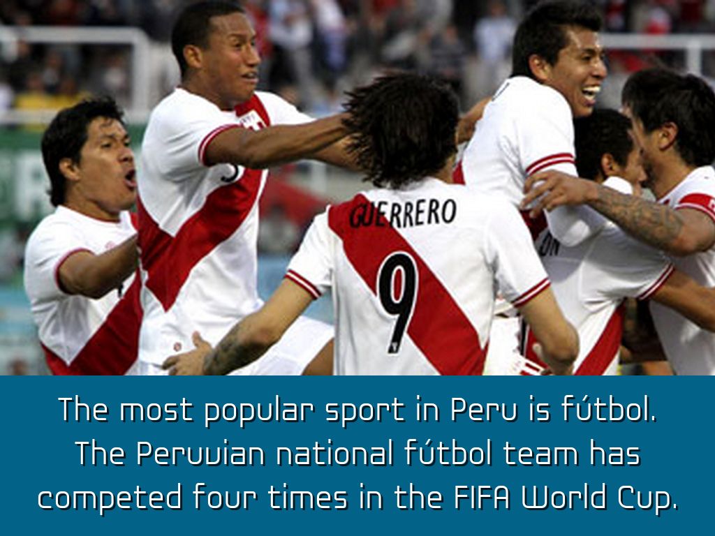 The most popular sport in Peru is fútbol. The Peruvian national fútbol team has competed four times in the FIFA World Cup.