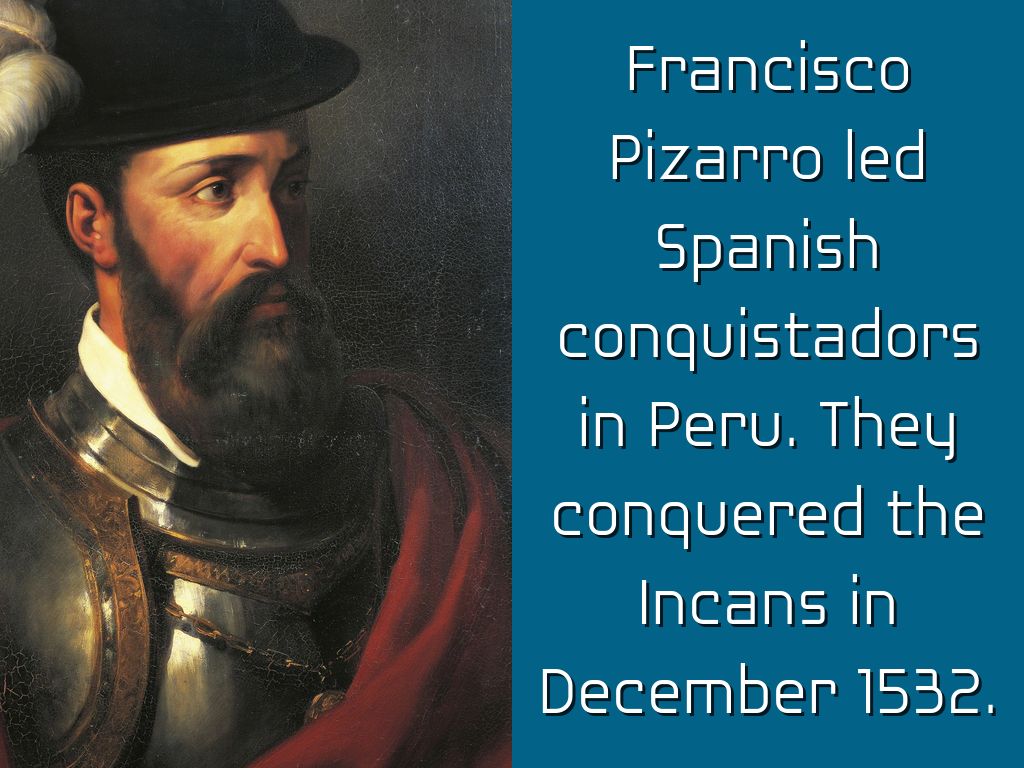 Francisco Pizarro led Spanish conquistadors in Peru. They conquered the Incans in December 1532.