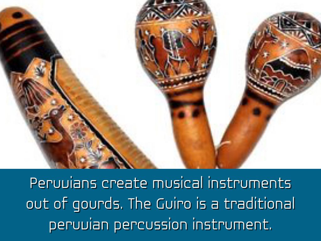 Peruvians create musical instruments out of gourds. The Guiro is a traditional peruvian percussion instrument.