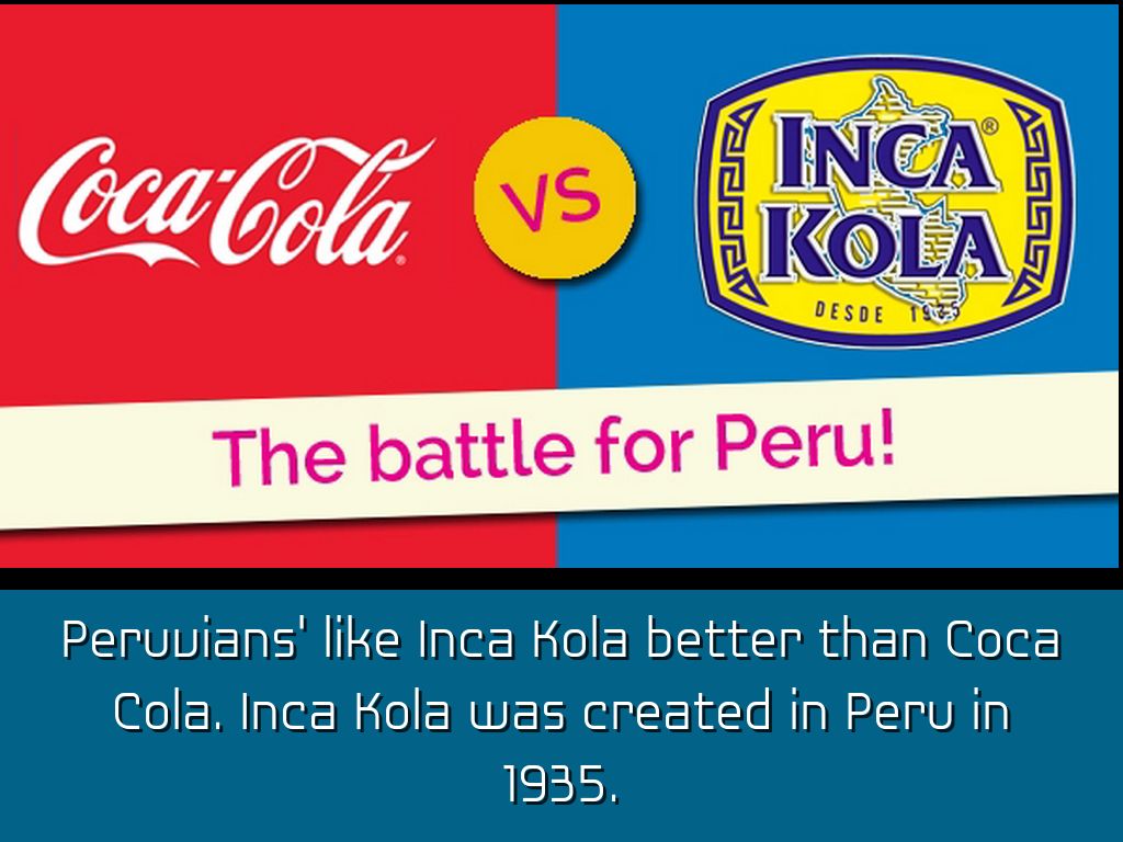 Peruvians' like Inca Kola better than Coca Cola. Inca Kola was created in Peru in 1935.