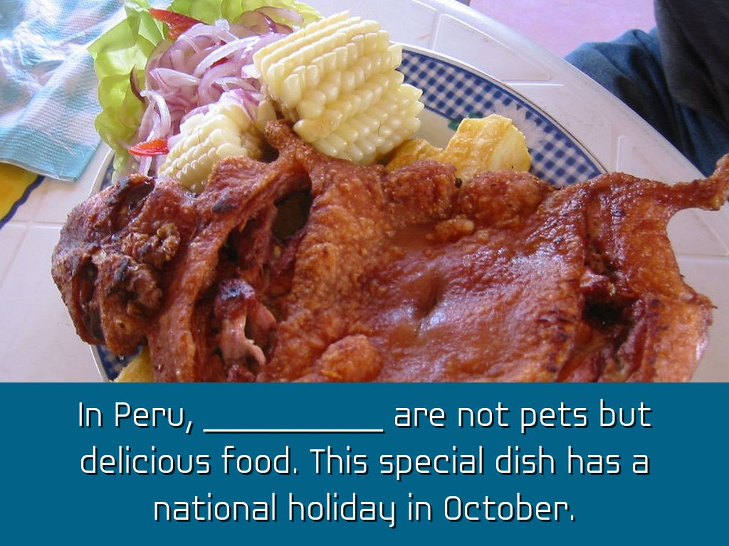 In Peru, _________ are not pets but delicious food. This special dish has a national holiday in October.