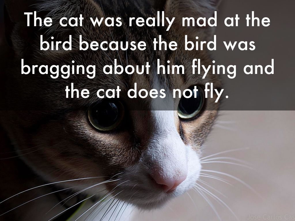 The cat was really mad at the bird because the bird was bragging about him flying and the cat does not fly.