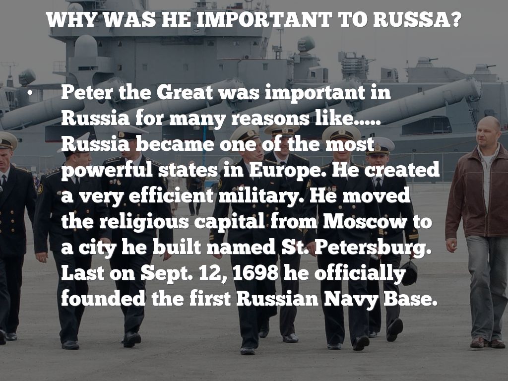 Peter the Great was important in Russia for many reasons like..... Russia became one of the most powerful states in Europe. He created a very efficient military. He moved the religious capital from Moscow to a city he built named St. Petersburg. Last on Sept. 12, 1698 he officially founded the first Russian Navy Base.