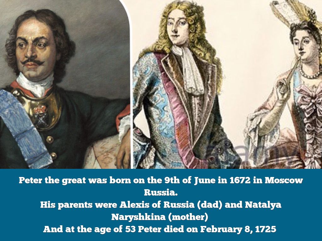 Peter the great was born on the 9th of June in 1672 in Moscow Russia. His parents were Alexis of Russia (dad) and Natalya Naryshkina (mother) And at the age of 53 Peter died on February 8, 1725