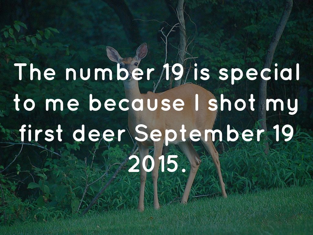 The number 19 is special to me because I shot my first deer September 19 2015.