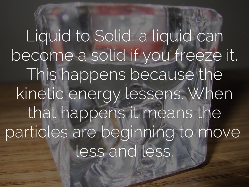 Liquid to Solid: a liquid can become a solid if you freeze it. This happens because the kinetic energy lessens. When that happens it means the particles are beginning to move less and less.