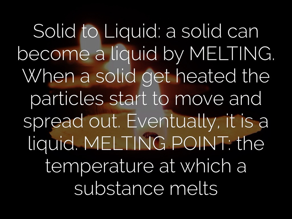 Solid to Liquid: a solid can become a liquid by MELTING. When a solid get heated the particles start to move and spread out. Eventually, it is a liquid. MELTING POINT: the temperature at which a substance melts