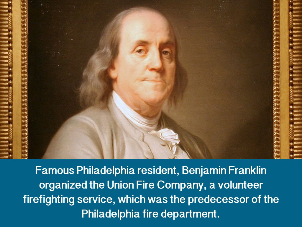 Famous Philadelphia resident, Benjamin Franklin organized the Union Fire Company, a volunteer firefighting service, which was the predecessor of the Philadelphia fire department.