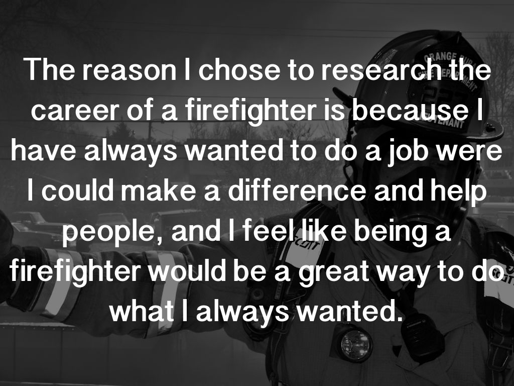 The reason I chose to research the career of a firefighter is because I have always wanted to do a job were I could make a difference and help people, and I feel like being a firefighter would be a great way to do what I always wanted.