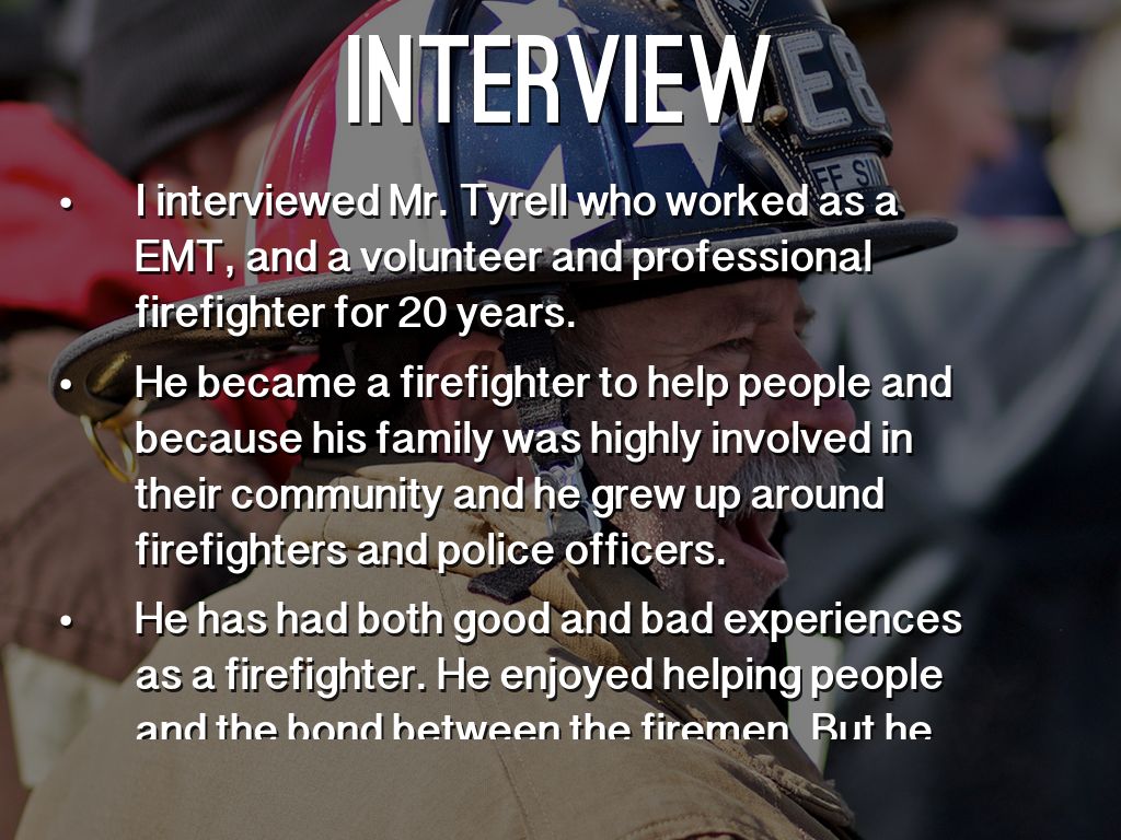 I interviewed Mr. Tyrell who worked as a EMT, and a volunteer and professional firefighter for 20 years.