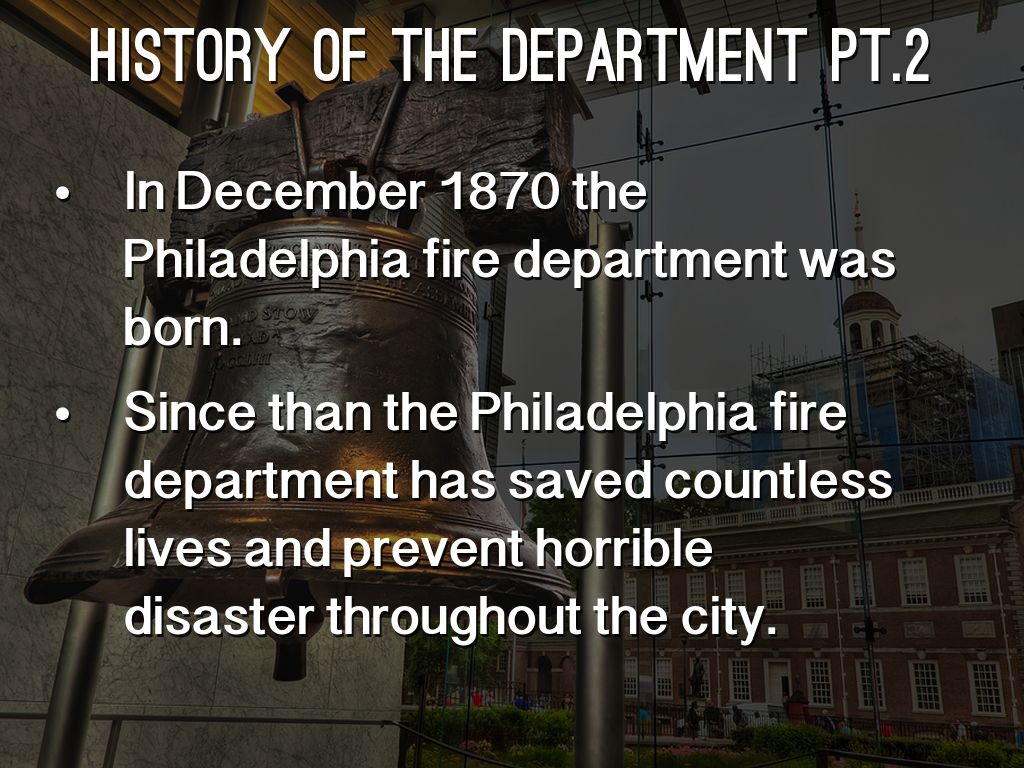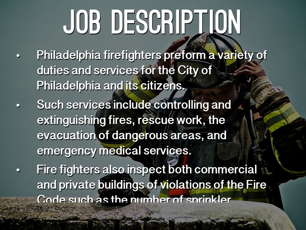 Philadelphia firefighters preform a variety of duties and services for the City of Philadelphia and its citizens.