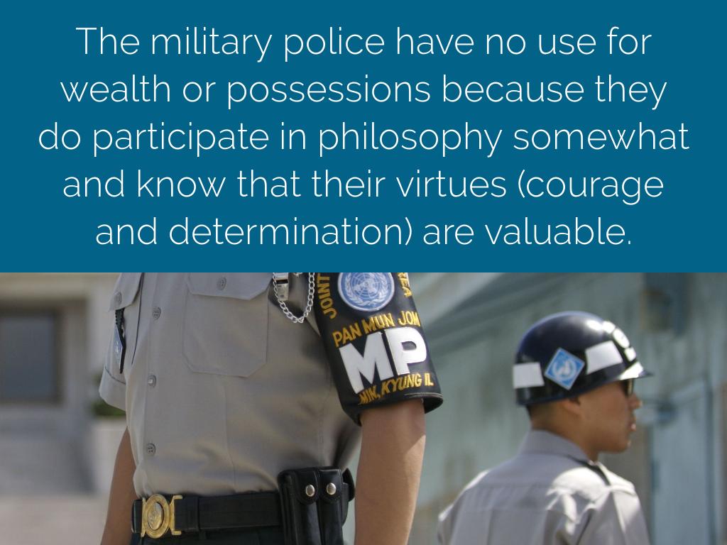 The military police have no use for wealth or possessions because they do participate in philosophy somewhat and know that their virtues (courage and determination) are valuable.