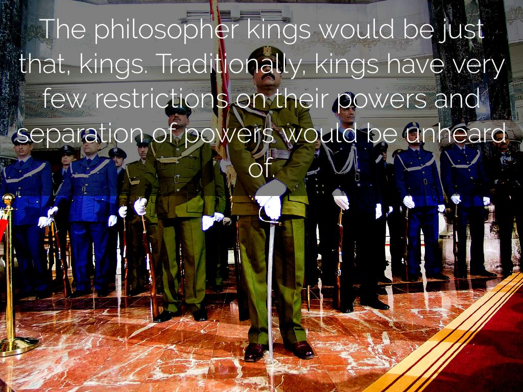 The philosopher kings would be just that, kings. Traditionally, kings have very few restrictions on their powers and separation of powers would be unheard of.
