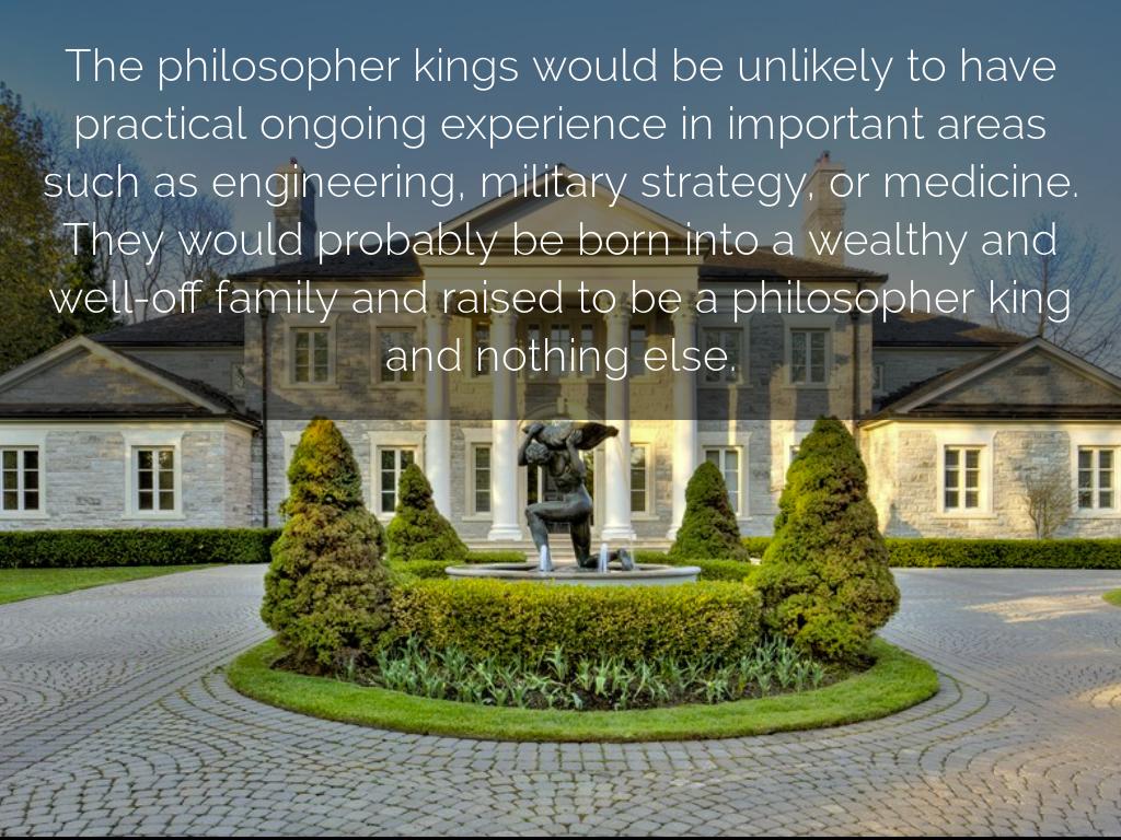 The philosopher kings would be unlikely to have practical ongoing experience in important areas such as engineering, military strategy, or medicine. They would probably be born into a wealthy and well-off family and raised to be a philosopher king and nothing else.
