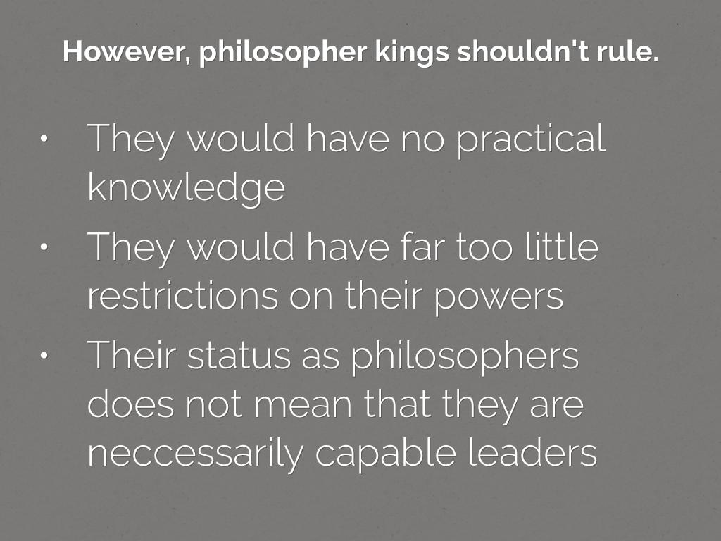 Plato thinks that the philosopher kings deserve to rule just because they have studied philosophy and are capable of it, however he's wrong. Many great leaders can be inspiring and capable without having knowledge of philosophy and vice versa.