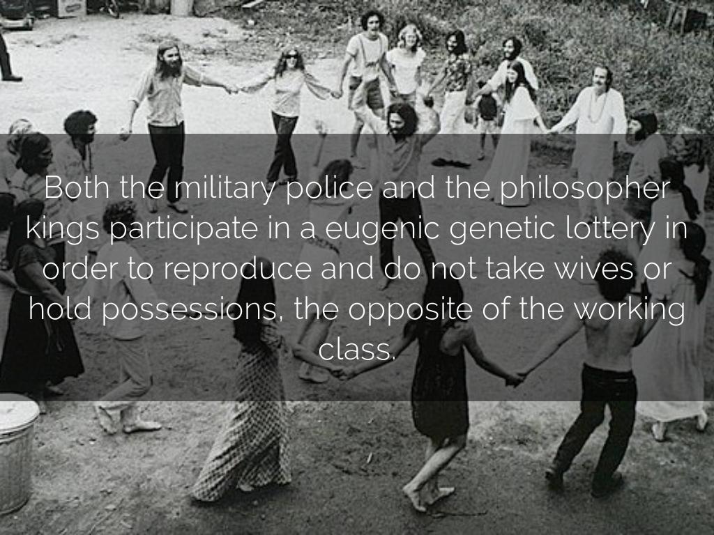 Both the military police and the philosopher kings participate in a eugenic genetic lottery in order to reproduce and do not take wives or hold possessions, the opposite of the working class.