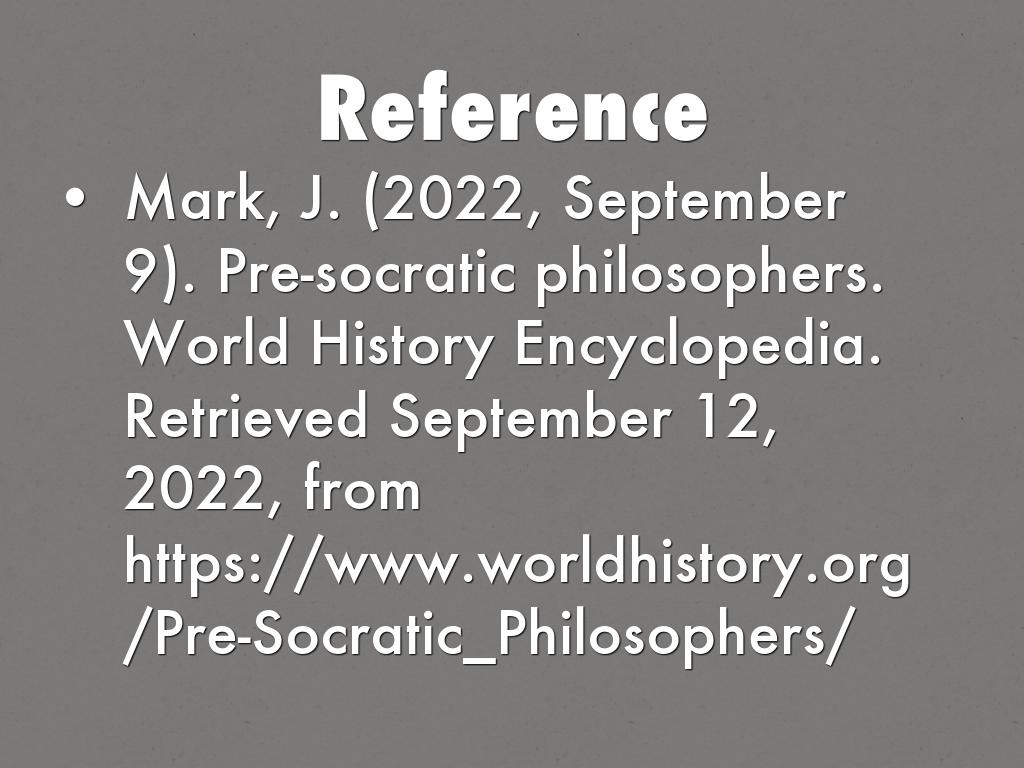 Mark, J. (2022, September 9). Pre-socratic philosophers. World History Encyclopedia. Retrieved September 12, 2022, from