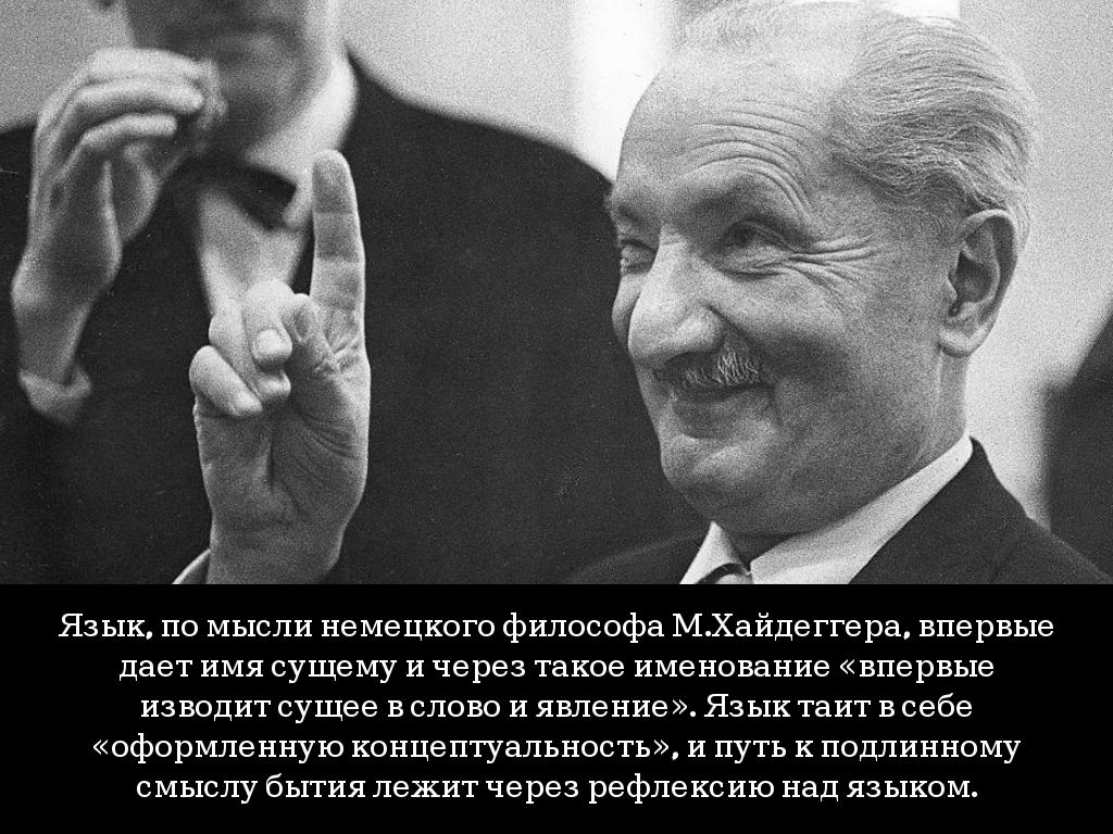 Язык, по мысли немецкого философа М.Хайдеггера, впервые дает имя сущему и через такое именование «впервые изводит сущее в слово и явление». Язык таит в себе «оформленную концептуальность», и путь к подлинному смыслу бытия лежит через рефлексию над языком.