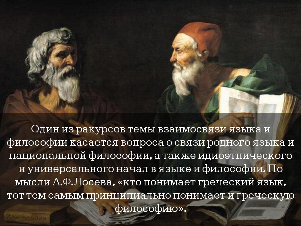 Один из ракурсов темы взаимосвязи языка и философии касается вопроса о связи родного языка и национальной философии, а также идиоэтнического и универсального начал в языке и философии. По мысли А.Ф.Лосева, «кто понимает греческий язык, тот тем самым принципиально понимает и греческую философию».