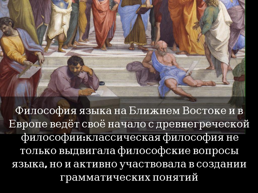 Философия языка на Ближнем Востоке и в Европе ведёт своё начало с древнегреческой философии:классическая философия не только выдвигала философские вопросы языка, но и активно участвовала в создании грамматических понятий