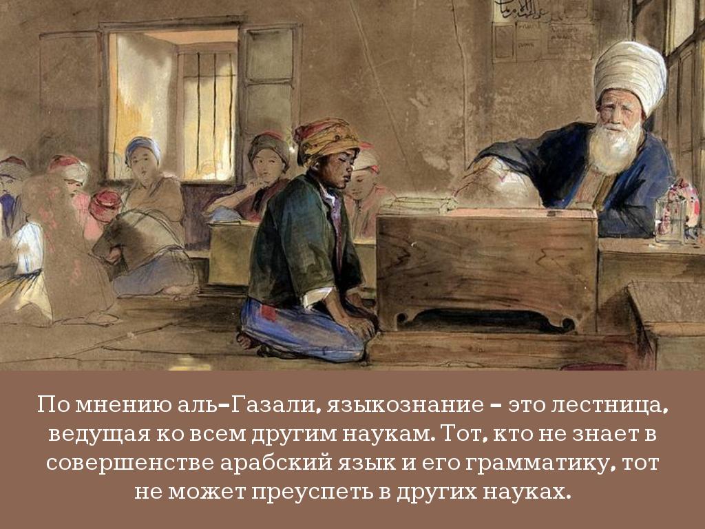 По мнению аль-Газали, языкознание - это лестница, ведущая ко всем другим наукам. Тот, кто не знает в совершенстве арабский язык и его грамматику, тот не может преуспеть в других науках.