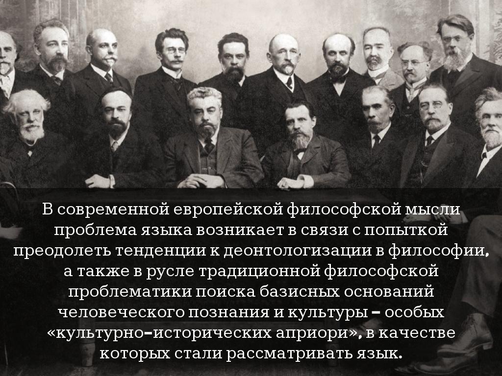 В современной европейской философской мысли проблема языка возникает в связи с попыткой преодолеть тенденции к деонтологизации в философии, а также в русле традиционной философской проблематики поиска базисных оснований человеческого познания и культуры – особых «культурно-исторических априори», в качестве которых стали рассматривать язык.