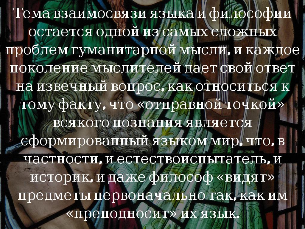 Тема взаимосвязи языка и философии остается одной из самых сложных проблем гуманитарной мысли, и каждое поколение мыслителей дает свой ответ на извечный вопрос, как относиться к тому факту, что «отправной точкой» всякого познания является сформированный языком мир, что, в частности, и естествоиспытатель, и историк, и даже философ «видят» предметы первоначально так, как им «преподносит» их язык.
