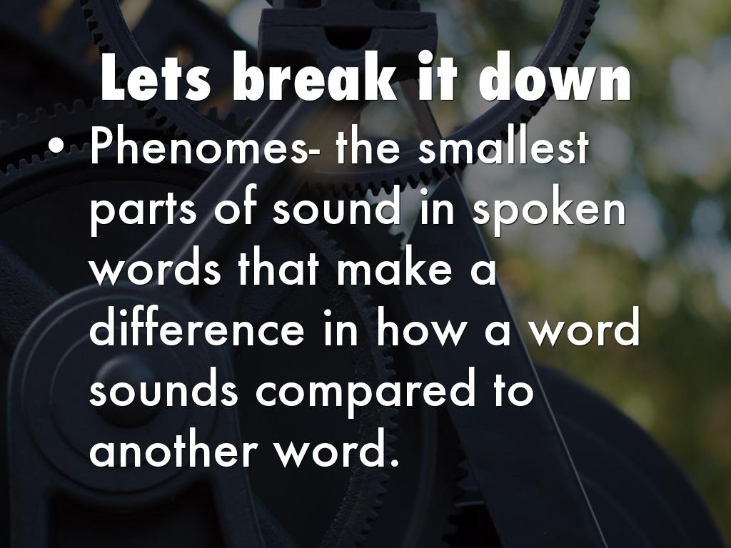 • Phenomes- the smallest parts of sound in spoken words that make a difference in how a word sounds compared to another word.