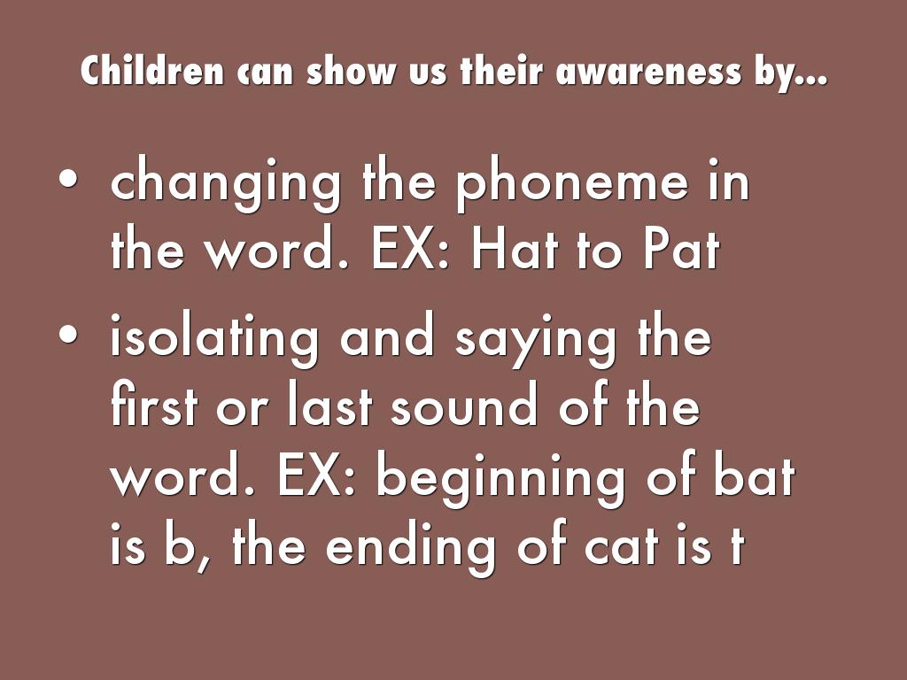 • isolating and saying the first or last sound of the word. EX: beginning of bat is b, the ending of cat is t