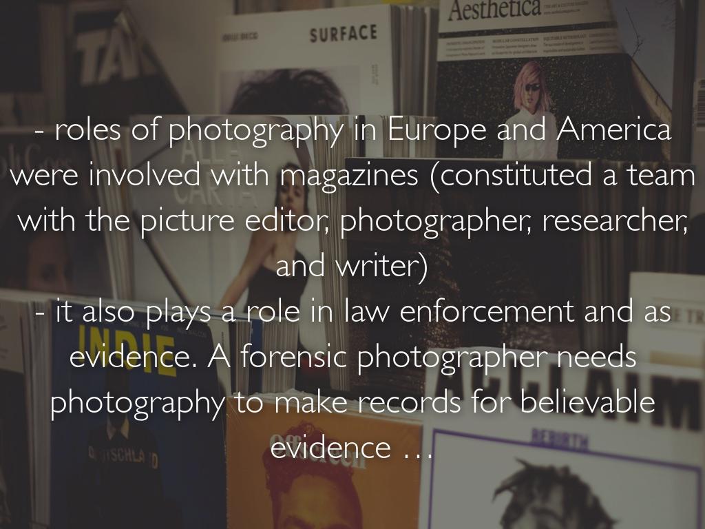 - roles of photography in Europe and America were involved with magazines (constituted a team with the picture editor, photographer, researcher, and writer)